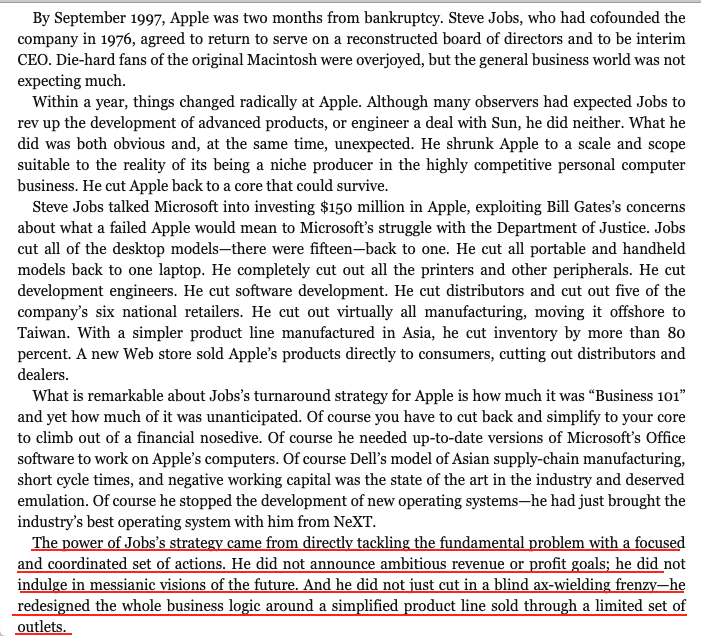 Jobs did not pretend that pushing on various levers or some excel modeling would magically make Apple the new leader on personal computing. Instead he was internally focused on execution and recognizing the next window of opportunity - that he could harness to his advantage. It would be **two years** before the opportunity opened again - with the iPod and the online music and with the iPhone.