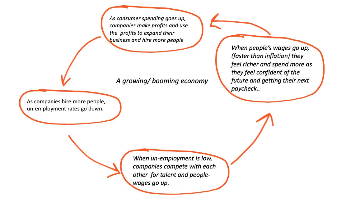 For the United States, consumer spending accounts for 70% of our GDP. Retail and Services industry are the two major buckets of consumer spending. Why is that important? I drew out a basic chart for what the inputs for a growing economy are : Low unemployment and rising wages.